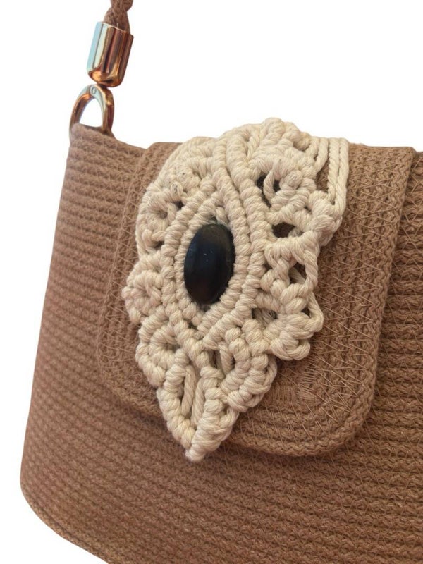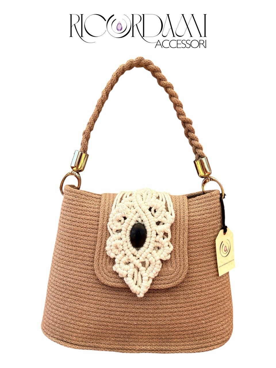 ORIGINE è una borsa artigianale realizzata in corda di cotone cucita, con chiusura flap a bottone magnetico. Il dettaglio centrale in macramè racchiude una pietra Shungite naturale, scelta per le sue proprietà di protezione e radicamento.