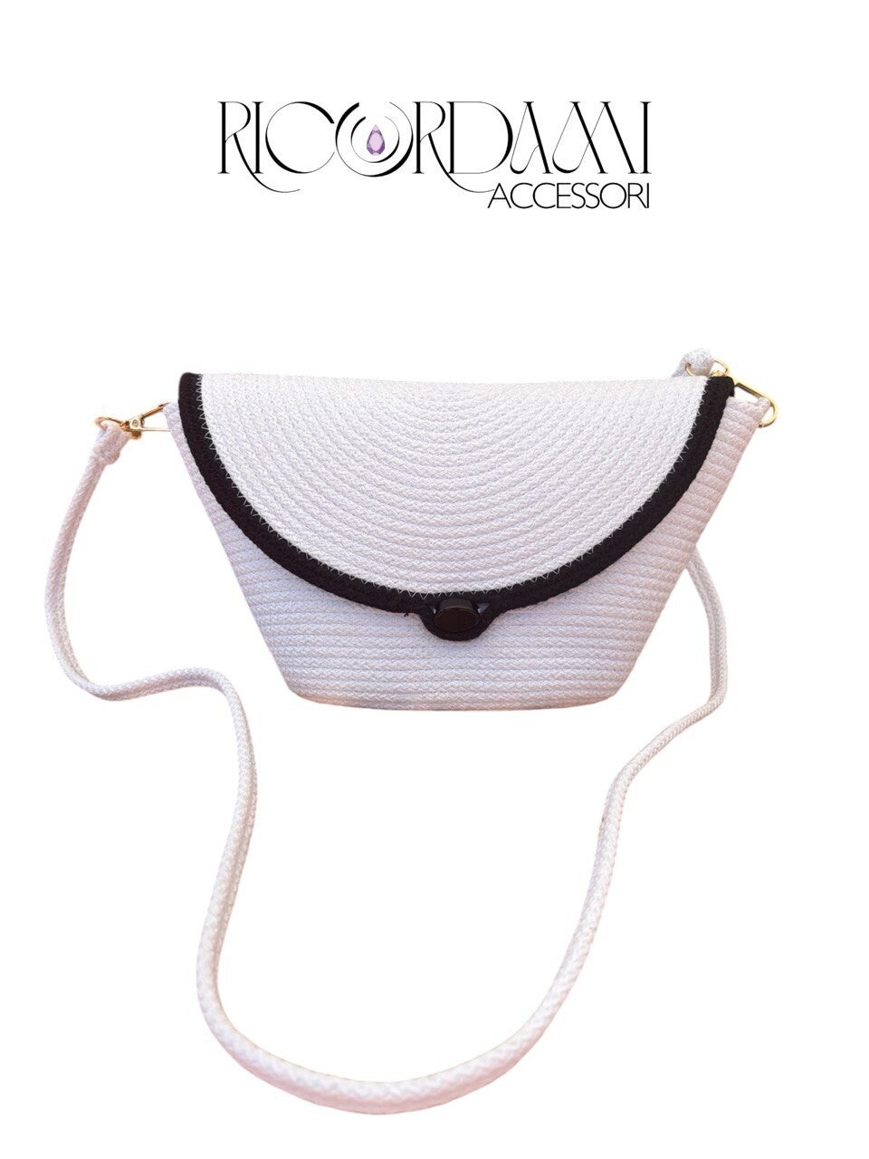 La borsa MINI è realizzata a mano in corda di cotone bianca e nera, con chiusura a bottone in cristallo di onice nera. Leggera e compatta, è perfetta per chi cerca un accessorio funzionale senza rinunciare allo stile. Ideale per un look sportivo o casual, da portare con comodità grazie alla tracolla.