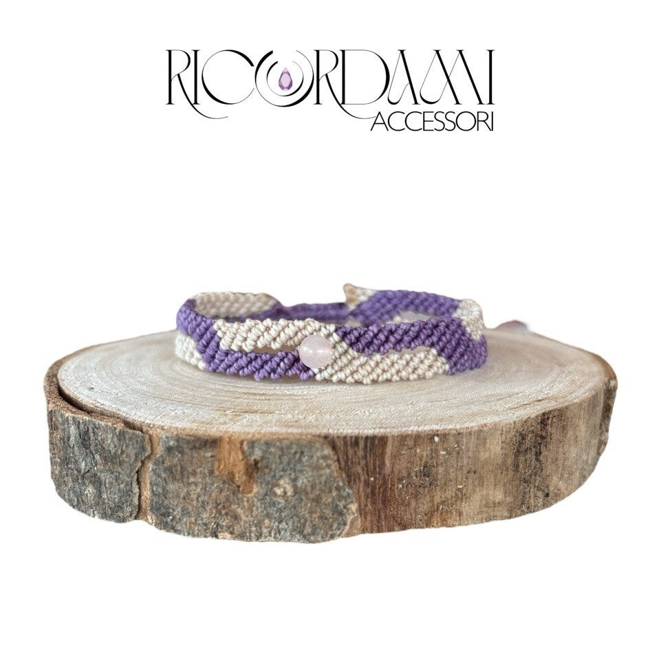 Scopri la delicatezza e l'eleganza del bracciale in micro macramè unisex, una creazione artigianale che unisce la soave armonia del glicine con la raffinata morbidezza del panna.