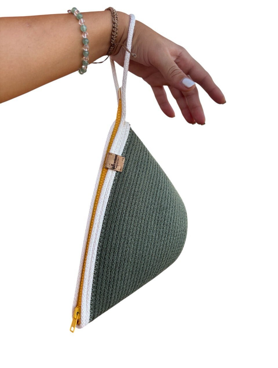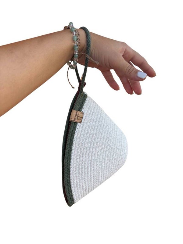 Cucite a mano , queste pochette sono realizzate con corda di cotone nei toni naturali del verde militare e panna.