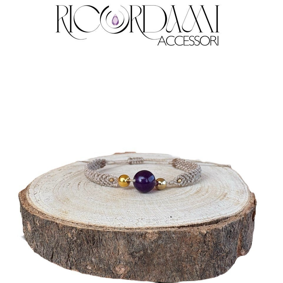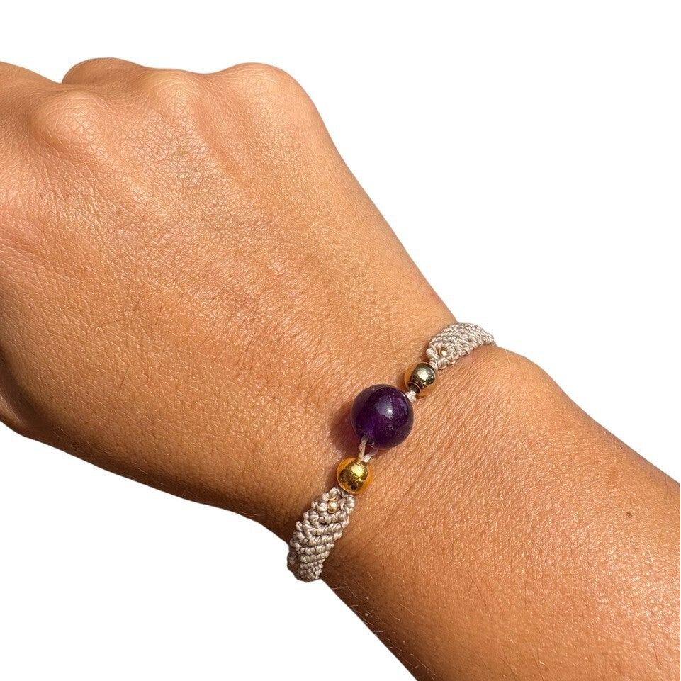 Bracciale realizzato a mano in micro macramè color panna, con pietra naturale Ametista.