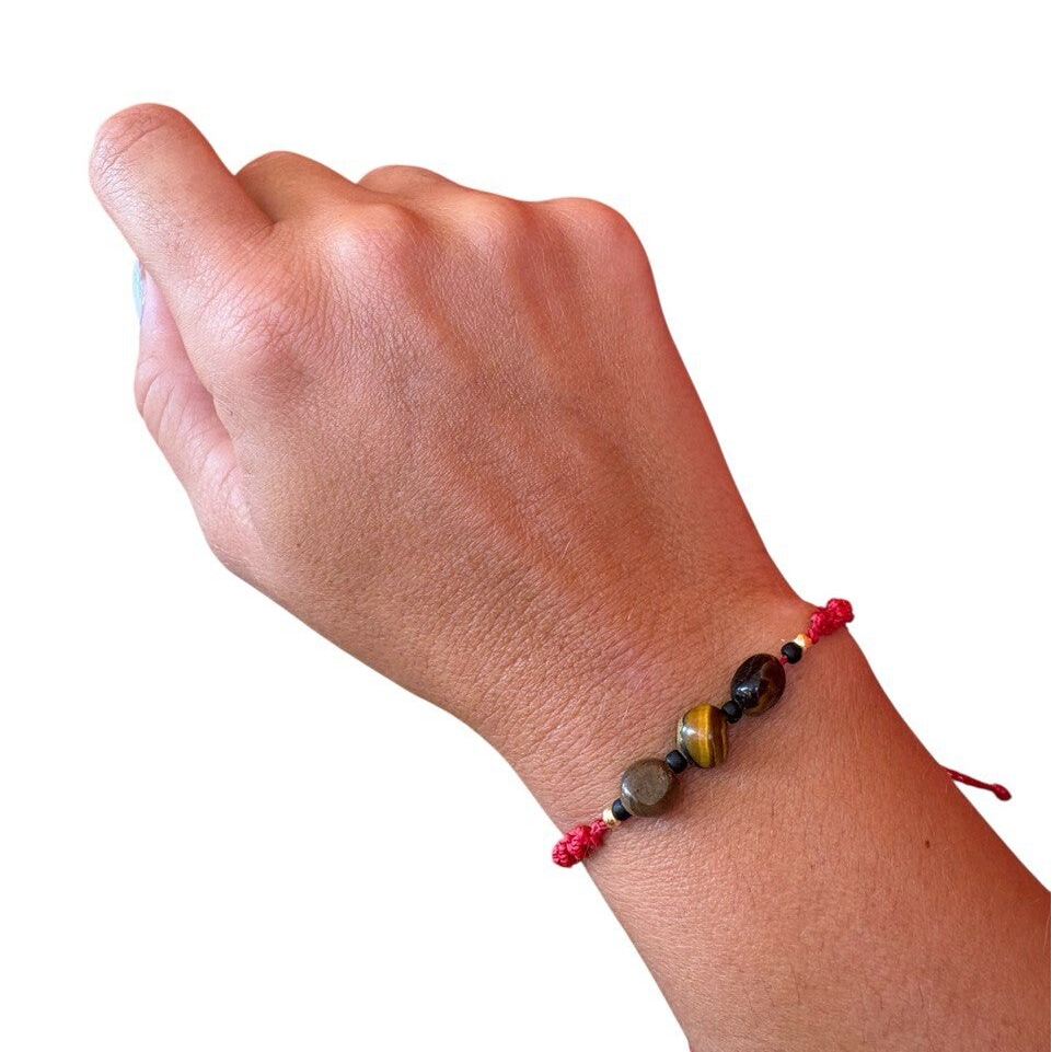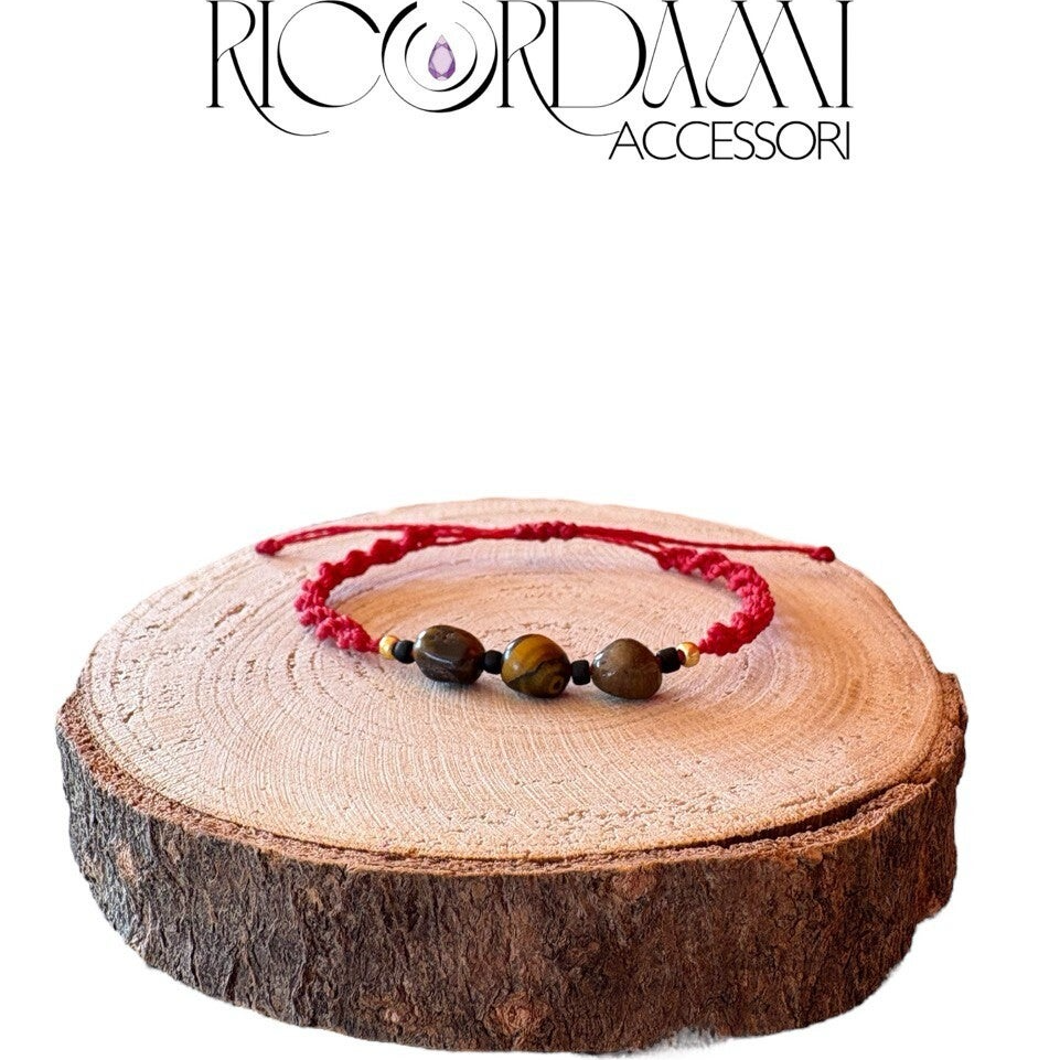 Bracciale artigianale in macramè colore rosso, intrecciato a mano con Occhio di Tigre naturale.