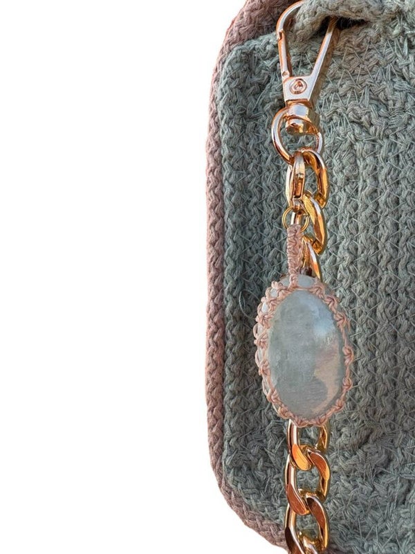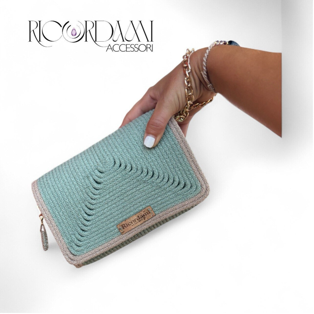 La borsa Ricordami unisce la freschezza del verde menta alla raffinatezza dei bordi color cappuccino. Perfetta per ogni occasione, puoi portarla a mano con il pratico bracciale da inserire al polso o usare la tracolla in catena oro per avere le mani libere.