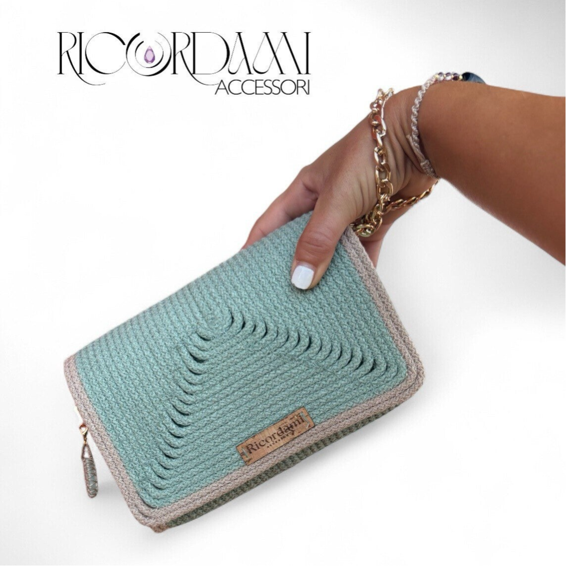 Il verde menta si abbina ai bordi color sabbia, creando un design fresco e naturale. Chiusura con bottone a calamita per una pratica apertura. La borsa è arricchita da un cristallo di acquamarina, simbolo di calma e armonia. È possibile personalizzarla con il cristallo preferito, per renderla unica e personale.