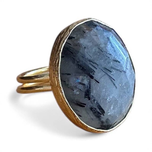 La pietra è caratterizzata dai tipici fili neri di tormalina inclusi nel quarzo, che rendono ogni anello unico e con una texture naturale molto riconoscibile.