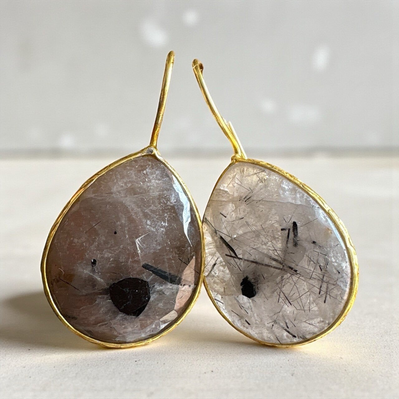 La pietra mostra le tipiche inclusioni nere di tormalina dentro il quarzo, creando un contrasto naturale molto riconoscibile.